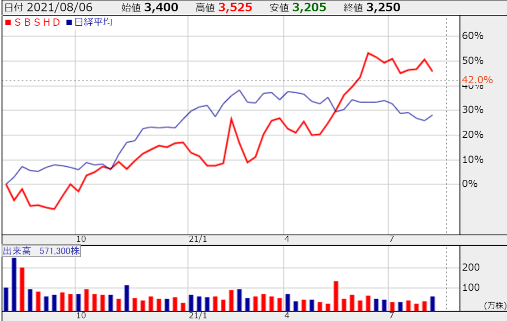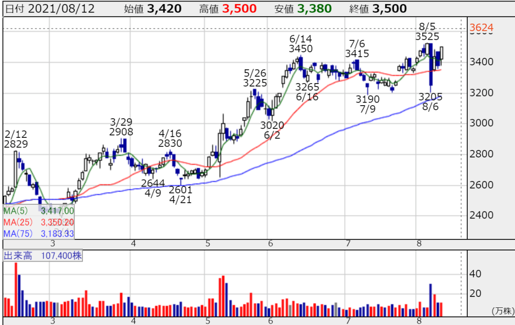 8月5日の週は、8月6日の午後1時に通期の上方修正&第2四半期決算の発表がありました。内容的には問題はなかったものの、材料出尽くし?で売られました。