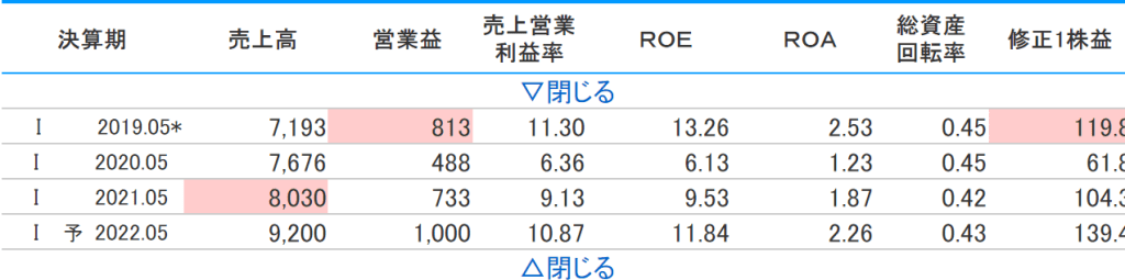 上場してから日が浅いので、2019年5月期からのものしかありませんでした。
